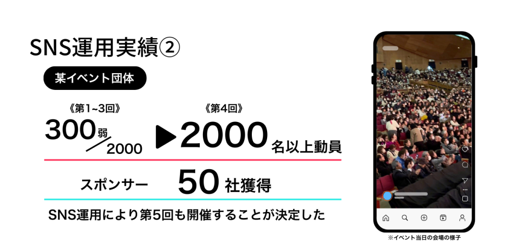イベント運用において重要なのは、短期間でどれだけ効果的に集客できるかです。イベントの特性や開催目的に応じたプロモーション戦略を設計し、集客から当日までを総合的にサポートします。SNSを活用した事前告知・拡散施策により、限られた期間でも高い集客効果を実現。イベント内容に合わせた投稿企画、動画・画像制作、配信スケジュール管理まで対応可能です。単発のイベント集客にとどまらず、次回開催や継続的なファン形成につながる運用を見据えたサポートを行います。