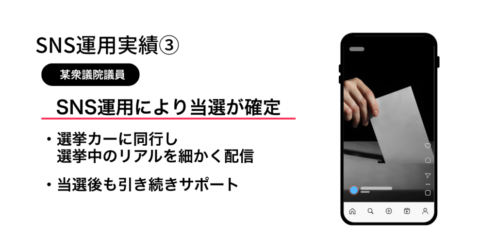 衆議院議員、県議会議員、市議会議員等の候補者のSNS戦略を専門的に設計します。投稿内容の企画、写真・動画撮影、世論分析をもとにしたタイミング戦略までを支援しています。広報活動を実現します。オンライン選挙戦略のノウハウを活かし、選挙期間中のみならず、平常時の発信も含めた長期的な広報体制を構築し、継続的な支持につながるデジタル戦略を伴走型でサポートします。